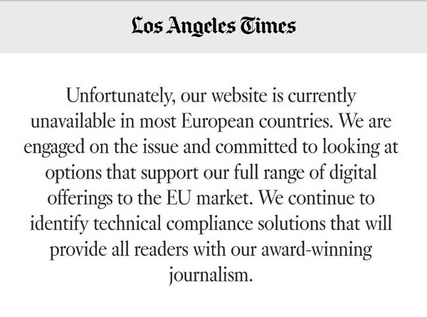 CNN points out that many sites based in North America are now blocking IP addresses based in the EU. Numerous gaming, media, and news sites now greet European visitors with pop-up ads informing them that, due to the GDPR’s stringent regulations, visitors from the EU will have to look elsewhere. Here, for instance, is what many EU visitors to the Los Angeles Times newspaper (one of America’s largest) see when they visit the website now: